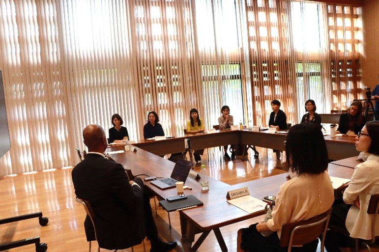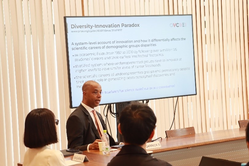 令和3(2021)年度から、Garrick副学長にはSTEP2研修の海外講師としてオンラインで研修を実施いただいておりましたが、今回初めて伊都キャンパスにお招きし、講義から研修生とのディスカッションまですべて対面で実施いただきました。Garrick副学長は、DE&I推進の担い手としての大学の変革力(Transformative Powers)を挙げつつ、ダイバーシティ・パラドックスと呼ばれる問題や、女性リーダー育成に向けてUIUCが取り組むプログラムなどを紹介されました。